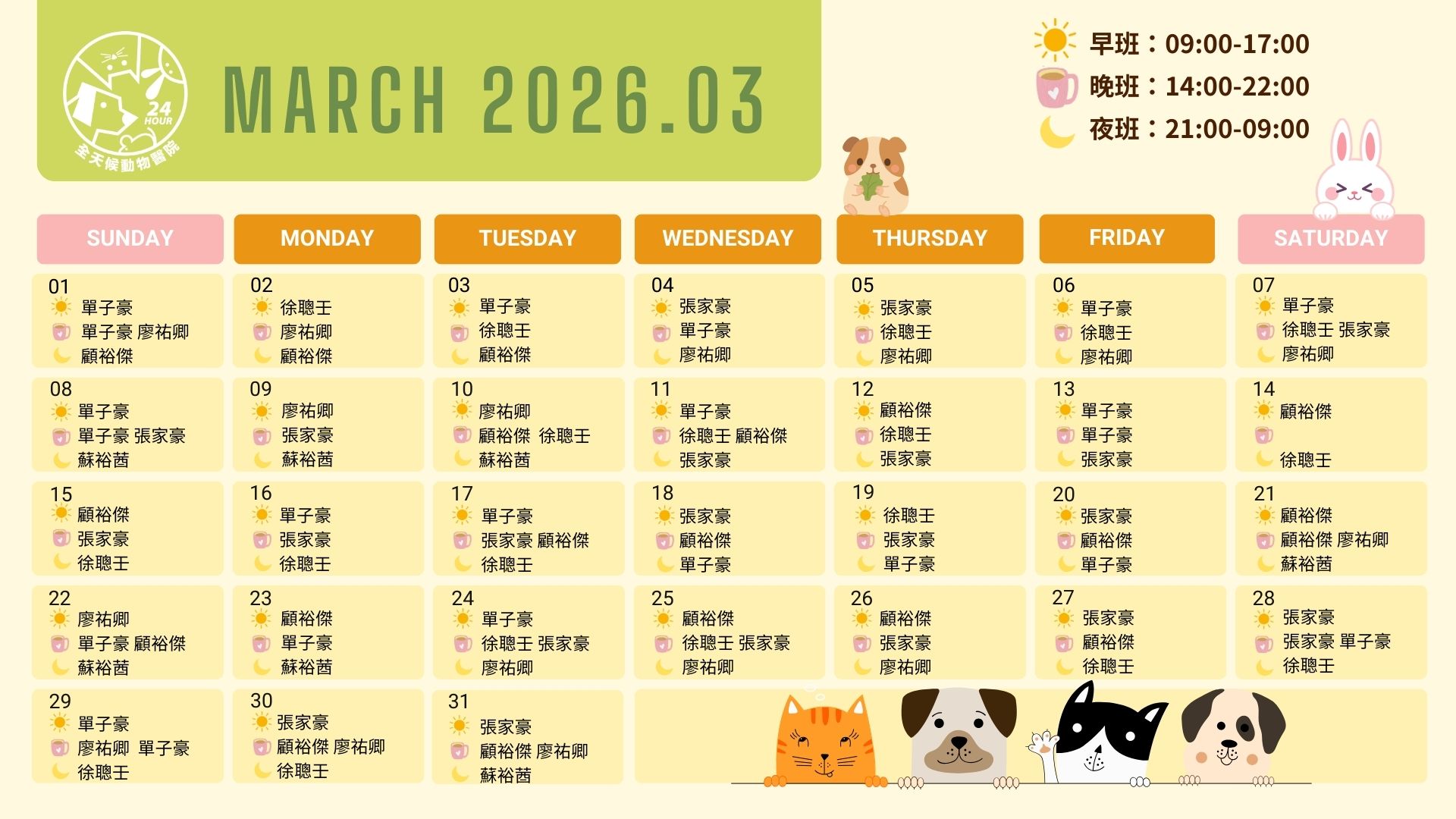 最新消息 | 全天候動物醫院2026年3月班表 | 24小時寵物全天門診 | 貓犬鼠兔急診